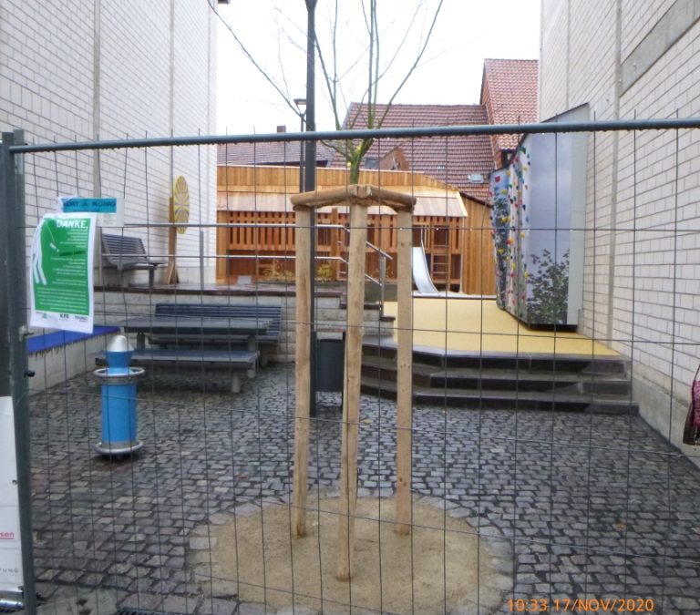 Für eine durch einen Brand entstandene Baulücke im Zentrum der Stadt konnte aufgrund der vorhandenen denkmalgeschützten Kellergewölbe keine Neubebauung realisiert werden. Dadurch fiel nach mehreren Jahren die Entscheidung zum Bau eines Spielplatzes. Durch die Berücksichtigung der denkmalgeschützten Bestandteile in der Erde ergaben sich die Höhenunterschiede auf dem Grundstück. Auf der Kletterwand ist einer der Türme der Stadtmauer abgebildet. Auf dem Spielplatz soll es künftig auch ein betreute Spielangebote geben.